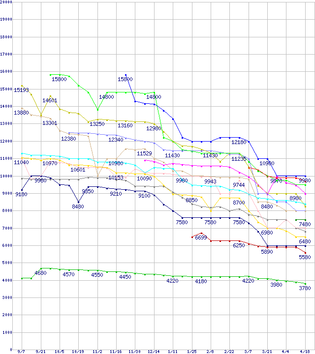 CPU主要製品(最安値1万円~2万円未満)の最安値推移