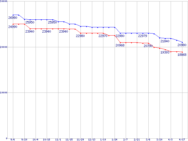 HDD/SSD 30GB~80GB未満の最安値推移