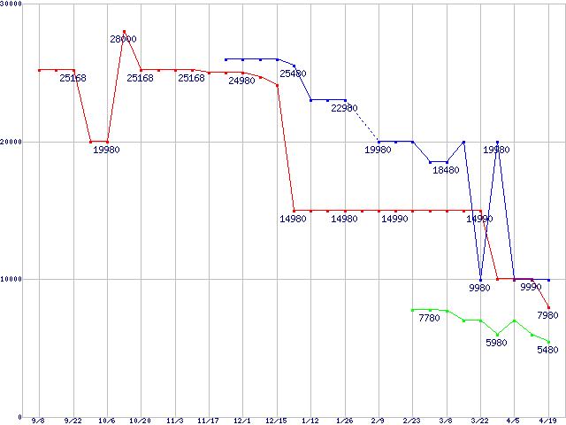 メモリ主要製品(最安値1万円以上)の最安値推移