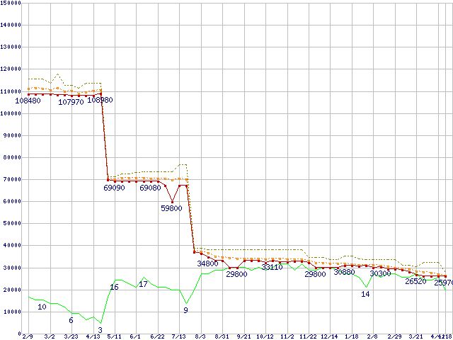 ※このグラフは過去のデータも税率5%相当に調整した税込み相当額のグラフです。 税率変更や、総額表示方式導入(2004年4月)の影響は除いています。 | | | ●凡例 | 最安値 (点線部は販売店未確認 または未調査) | 平均値 | 最高値 | ショップ数 |