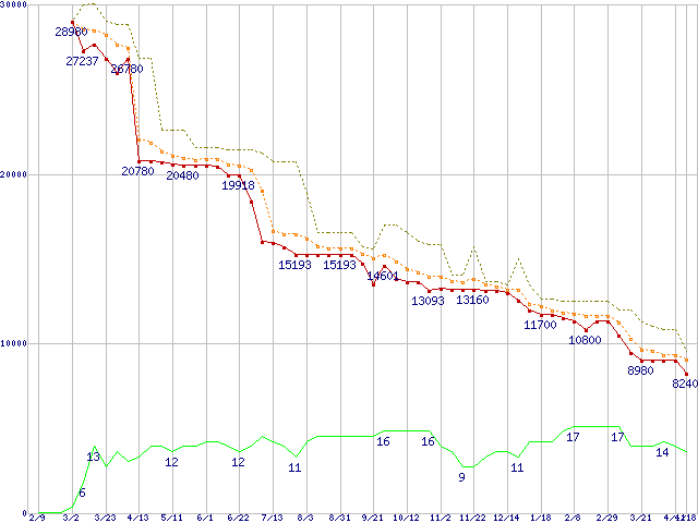 | Athlon 64 X2 5000+ (2.6GHz,L2 512KB×2)の価格推移 | | | (2007年2月9日~2008年4月18日) |