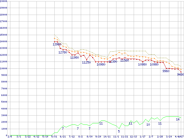 ※このグラフは過去のデータも税率5%相当に調整した税込み相当額のグラフです。 税率変更や、総額表示方式導入(2004年4月)の影響は除いています。 | | | ●凡例 | 最安値 (点線部は販売店未確認 または未調査) | 平均値 | 最高値 | ショップ数 |
