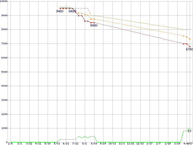 ※このグラフは過去のデータも税率5%相当に調整した税込み相当額のグラフです。 税率変更や、総額表示方式導入(2004年4月)の影響は除いています。 | | | ●凡例 | 最安値 (点線部は販売店未確認 または未調査) | 平均値 | 最高値 | ショップ数 |