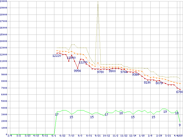 ※このグラフは過去のデータも税率5%相当に調整した税込み相当額のグラフです。 税率変更や、総額表示方式導入(2004年4月)の影響は除いています。 | | | ●凡例 | 最安値 (点線部は販売店未確認 または未調査) | 平均値 | 最高値 | ショップ数 |