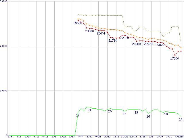 | Core 2 Duo E6750 (2.66GHz,L2 4MB)の価格推移 | | | (2007年2月9日~2008年4月18日) |