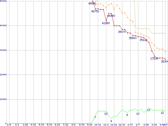 ※このグラフは過去のデータも税率5%相当に調整した税込み相当額のグラフです。 税率変更や、総額表示方式導入(2004年4月)の影響は除いています。 | | | ●凡例 | 最安値 (点線部は販売店未確認 または未調査) | 平均値 | 最高値 | ショップ数 |
