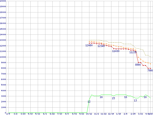 | Athlon X2 BE-2400 (2.3GHz,L2 512KB×2)の価格推移 | | | (2007年2月9日~2008年4月18日) |
