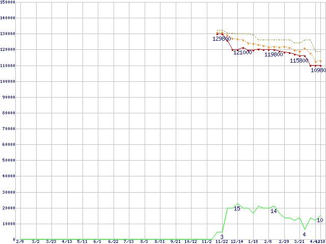 ※このグラフは過去のデータも税率5%相当に調整した税込み相当額のグラフです。 税率変更や、総額表示方式導入(2004年4月)の影響は除いています。 | | | ●凡例 | 最安値 (点線部は販売店未確認 または未調査) | 平均値 | 最高値 | ショップ数 |