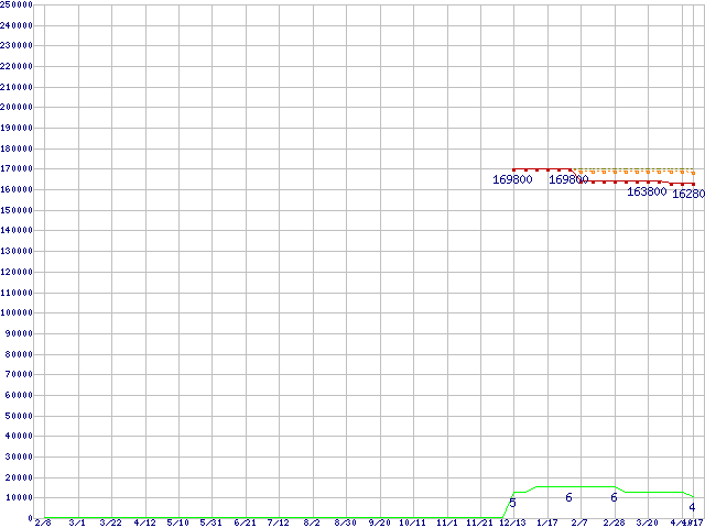 ※このグラフは過去のデータも税率5%相当に調整した税込み相当額のグラフです。 税率変更や、総額表示方式導入(2004年4月)の影響は除いています。 | | | ●凡例 | 最安値 (点線部は販売店未確認 または未調査) | 平均値 | 最高値 | ショップ数 |