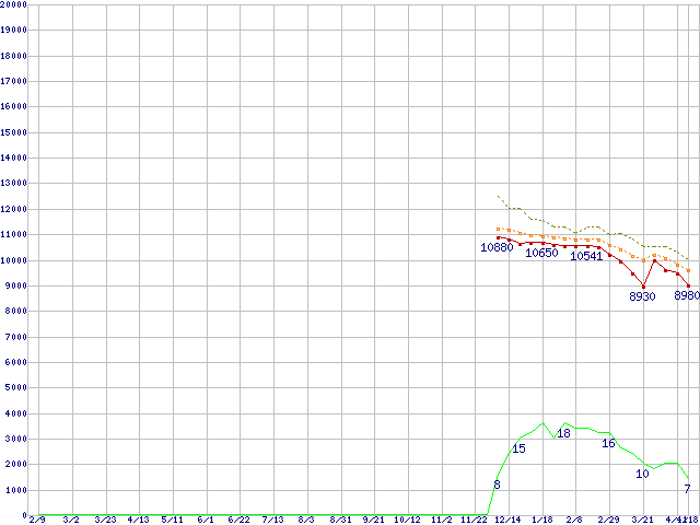 ※このグラフは過去のデータも税率5%相当に調整した税込み相当額のグラフです。 税率変更や、総額表示方式導入(2004年4月)の影響は除いています。 | | | ●凡例 | 最安値 (点線部は販売店未確認 または未調査) | 平均値 | 最高値 | ショップ数 |
