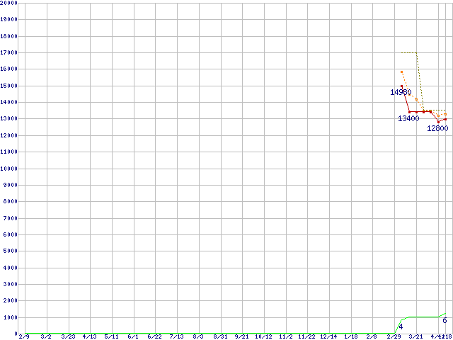 ※このグラフは過去のデータも税率5%相当に調整した税込み相当額のグラフです。 税率変更や、総額表示方式導入(2004年4月)の影響は除いています。 | | | ●凡例 | 最安値 (点線部は販売店未確認 または未調査) | 平均値 | 最高値 | ショップ数 |