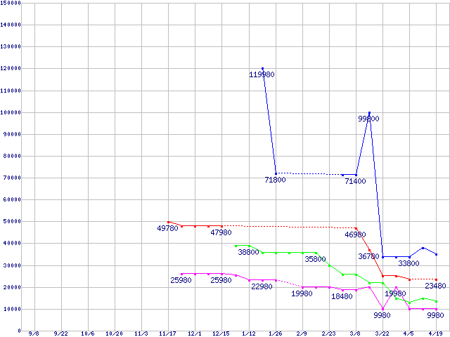 PC2-6400(DDR2-800) DDR2 SDRAM DIMMの最安値推移