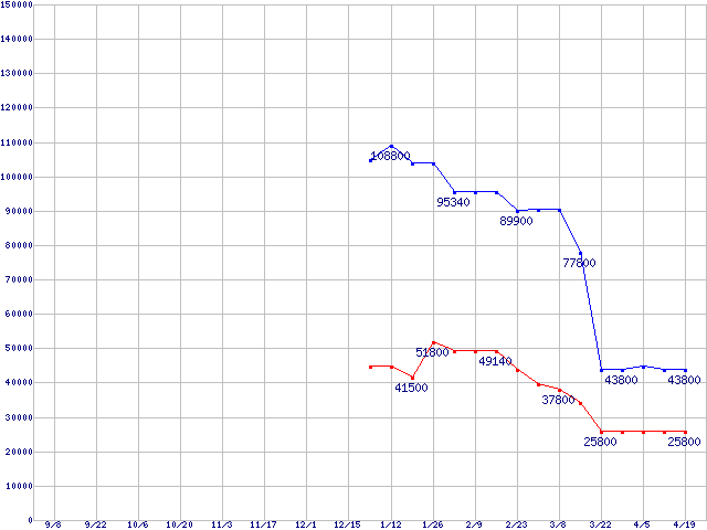 PC2-6400(DDR2-800) DDR2 SDRAM DIMMの最安値推移