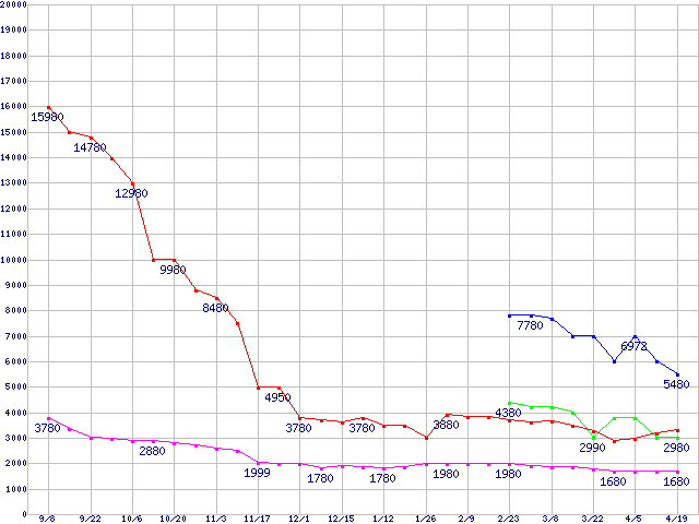 PC2-6400(DDR2-800) DDR2 SDRAM DIMMの最安値推移
