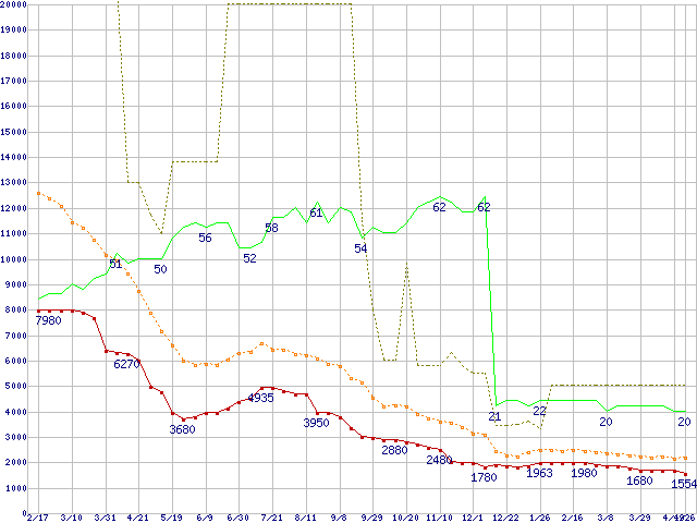 ※このグラフは過去のデータも税率5%相当に調整した税込み相当額のグラフです。 税率変更や、総額表示方式導入(2004年4月)の影響は除いています。 | | | ●凡例 | 最安値 (点線部は販売店未確認 または未調査) | 平均値 | 最高値 | ショップ数 |