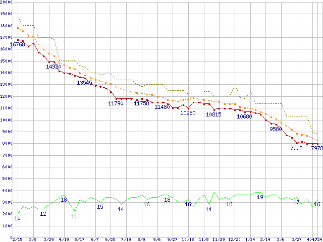 ※このグラフは過去のデータも税率5%相当に調整した税込み相当額のグラフです。 税率変更や、総額表示方式導入(2004年4月)の影響は除いています。 | | | ●凡例 | 最安値 (点線部は販売店未確認 または未調査) | 平均値 | 最高値 | ショップ数 |