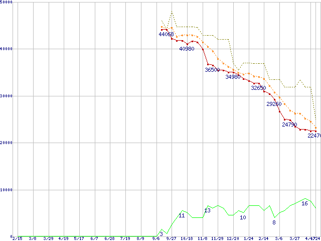 ※このグラフは過去のデータも税率5%相当に調整した税込み相当額のグラフです。 税率変更や、総額表示方式導入(2004年4月)の影響は除いています。 | | | ●凡例 | 最安値 (点線部は販売店未確認 または未調査) | 平均値 | 最高値 | ショップ数 |