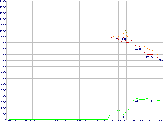 ※このグラフは過去のデータも税率5%相当に調整した税込み相当額のグラフです。 税率変更や、総額表示方式導入(2004年4月)の影響は除いています。 | | | ●凡例 | 最安値 (点線部は販売店未確認 または未調査) | 平均値 | 最高値 | ショップ数 |