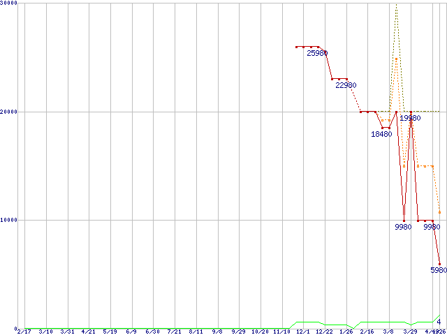 ※このグラフは過去のデータも税率5%相当に調整した税込み相当額のグラフです。 税率変更や、総額表示方式導入(2004年4月)の影響は除いています。 | | | ●凡例 | 最安値 (点線部は販売店未確認 または未調査) | 平均値 | 最高値 | ショップ数 |