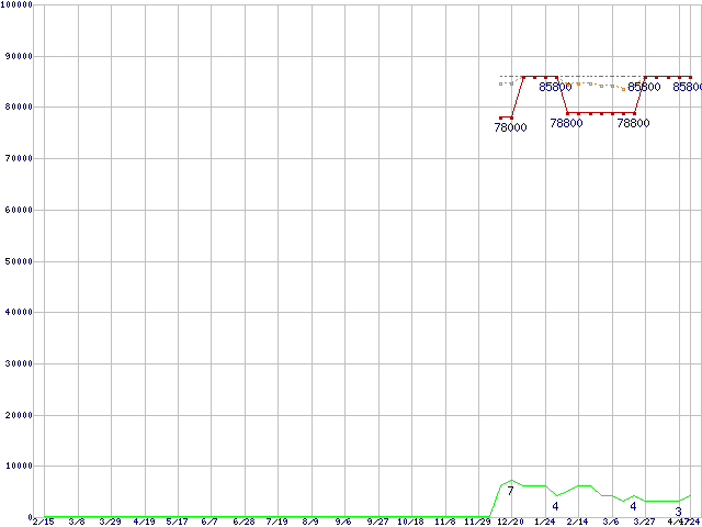※このグラフは過去のデータも税率5%相当に調整した税込み相当額のグラフです。 税率変更や、総額表示方式導入(2004年4月)の影響は除いています。 | | | ●凡例 | 最安値 (点線部は販売店未確認 または未調査) | 平均値 | 最高値 | ショップ数 |