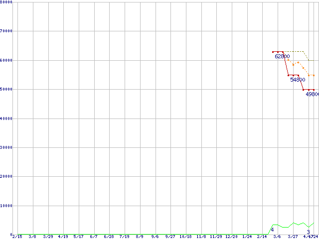 ※このグラフは過去のデータも税率5%相当に調整した税込み相当額のグラフです。 税率変更や、総額表示方式導入(2004年4月)の影響は除いています。 | | | ●凡例 | 最安値 (点線部は販売店未確認 または未調査) | 平均値 | 最高値 | ショップ数 |