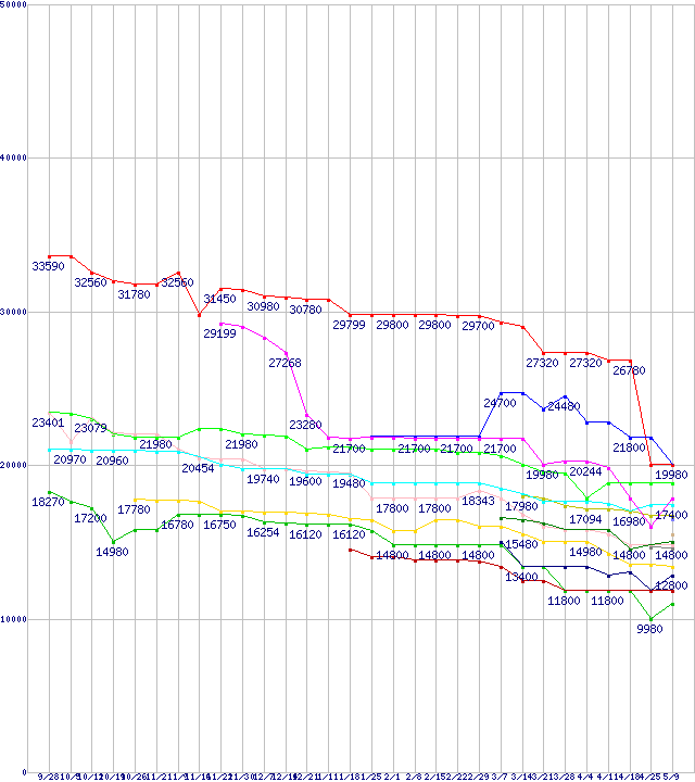 | CPU主要製品(最安値1万円~2万円未満)の最安値推移 | | | (2007年9月28日~2008年5月9日) |