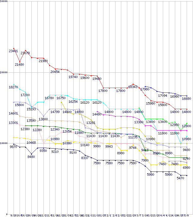 | 凡例 | Athlon 64 X2 6400+ (3.2GHz,L2 1MB×2) | Athlon 64 X2 6000+ (3.0GHz,L2 1MB×2) | Athlon 64 X2 5600+ (2.9GHz,L2 512KB×2) | Athlon 64 X2 5400+ (2.8GHz,L2 512KB×2) | Athlon 64 X2 5600+ (2.8GHz,L2 1MB×2) | Athlon 64 X2 5200+ (2.7GHz,L2 512KB×2) | Athlon 64 X2 5000+ Black Edition (2.6GHz,L2 512KB×2) | Athlon 64 X2 5000+ (2.6GHz,L2 512KB×2) | Athlon X2 BE-2400 (2.3GHz,L2 512KB×2) | Athlon 64 X2 4800+ (2.5GHz,L2 512KB×2) | Athlon X2 4600 (2.4GHz,L2 512KB×2) | Athlon X2 BE-2350 (2.1GHz,L2 512KB×2) | Athlon 64 X2 4200+ (2.2GHz,L2 512KB×2) | ※製品名をクリックすると個別のグラフを表示します ※点線部は販売店が確認できなかった、または調査データがないことを示します |
