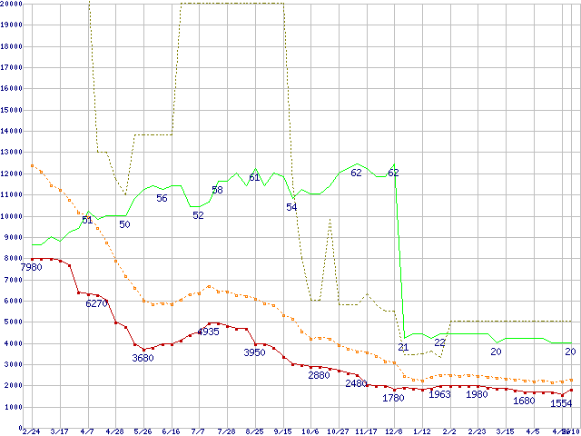 ※このグラフは過去のデータも税率5%相当に調整した税込み相当額のグラフです。 税率変更や、総額表示方式導入(2004年4月)の影響は除いています。 | | | ●凡例 | 最安値 (点線部は販売店未確認 または未調査) | 平均値 | 最高値 | ショップ数 |