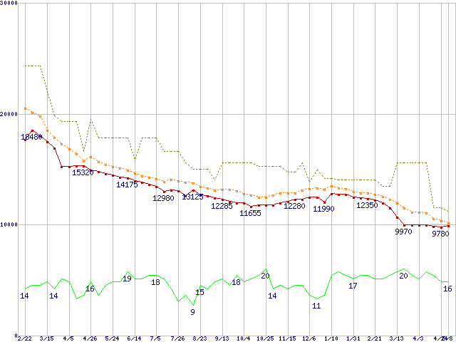 ※このグラフは過去のデータも税率5%相当に調整した税込み相当額のグラフです。 税率変更や、総額表示方式導入(2004年4月)の影響は除いています。 | | | ●凡例 | 最安値 (点線部は販売店未確認 または未調査) | 平均値 | 最高値 | ショップ数 |