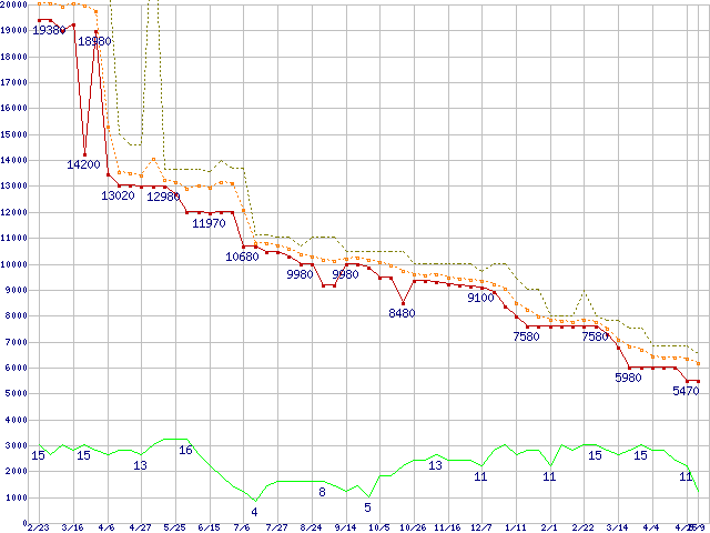 ※このグラフは過去のデータも税率5%相当に調整した税込み相当額のグラフです。 税率変更や、総額表示方式導入(2004年4月)の影響は除いています。 | | | ●凡例 | 最安値 (点線部は販売店未確認 または未調査) | 平均値 | 最高値 | ショップ数 |