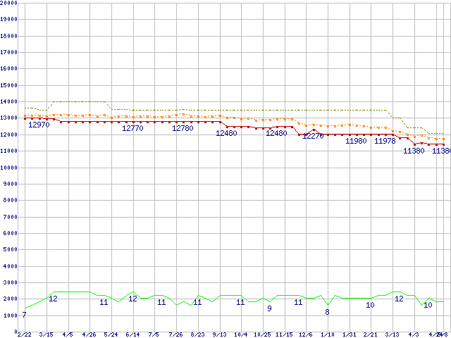 ※このグラフは過去のデータも税率5%相当に調整した税込み相当額のグラフです。 税率変更や、総額表示方式導入(2004年4月)の影響は除いています。 | | | ●凡例 | 最安値 (点線部は販売店未確認 または未調査) | 平均値 | 最高値 | ショップ数 |