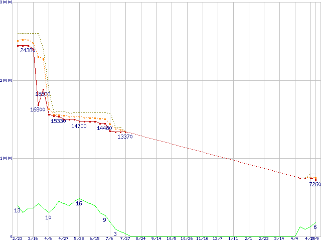 | Athlon X2 4600 (2.4GHz,L2 512KB×2)の価格推移 | | | (2007年2月23日~2008年5月9日) |