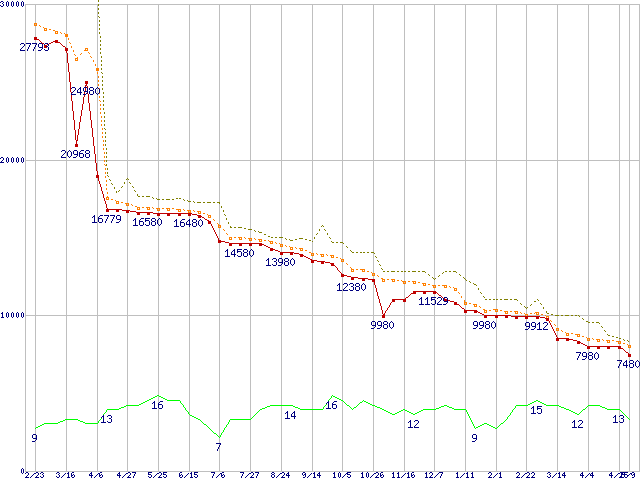 ※このグラフは過去のデータも税率5%相当に調整した税込み相当額のグラフです。 税率変更や、総額表示方式導入(2004年4月)の影響は除いています。 | | | ●凡例 | 最安値 (点線部は販売店未確認 または未調査) | 平均値 | 最高値 | ショップ数 |