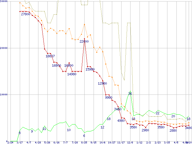 PC2-6400(DDR2-800) DDR2 SDRAM DIMMの最安値推移
