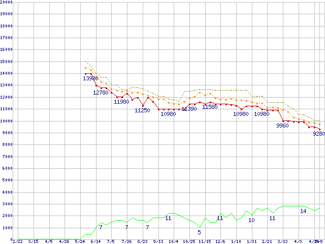 ※このグラフは過去のデータも税率5%相当に調整した税込み相当額のグラフです。 税率変更や、総額表示方式導入(2004年4月)の影響は除いています。 | | | ●凡例 | 最安値 (点線部は販売店未確認 または未調査) | 平均値 | 最高値 | ショップ数 |