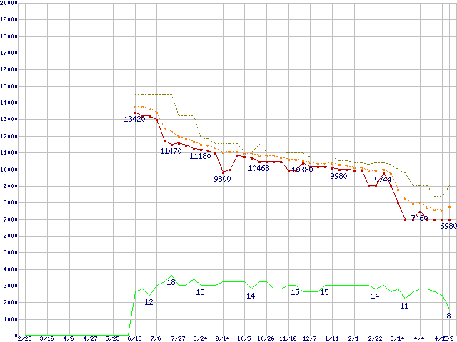 ※このグラフは過去のデータも税率5%相当に調整した税込み相当額のグラフです。 税率変更や、総額表示方式導入(2004年4月)の影響は除いています。 | | | ●凡例 | 最安値 (点線部は販売店未確認 または未調査) | 平均値 | 最高値 | ショップ数 |