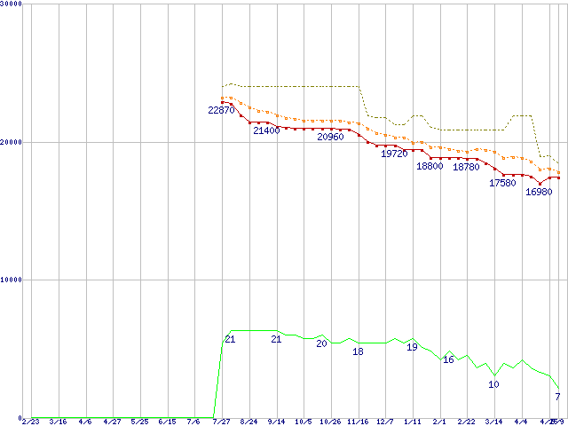 | Core 2 Duo E6550 (2.33GHz,L2 4MB)の価格推移 | | | (2007年2月23日~2008年5月9日) |