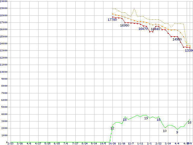 ※このグラフは過去のデータも税率5%相当に調整した税込み相当額のグラフです。 税率変更や、総額表示方式導入(2004年4月)の影響は除いています。 | | | ●凡例 | 最安値 (点線部は販売店未確認 または未調査) | 平均値 | 最高値 | ショップ数 |