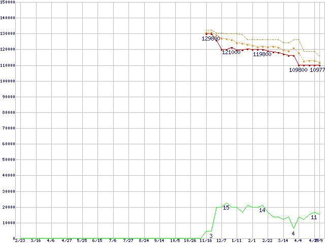※このグラフは過去のデータも税率5%相当に調整した税込み相当額のグラフです。 税率変更や、総額表示方式導入(2004年4月)の影響は除いています。 | | | ●凡例 | 最安値 (点線部は販売店未確認 または未調査) | 平均値 | 最高値 | ショップ数 |