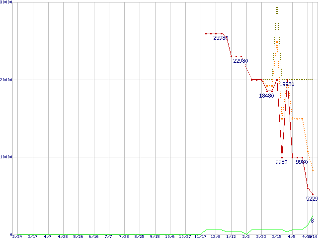 ※このグラフは過去のデータも税率5%相当に調整した税込み相当額のグラフです。 税率変更や、総額表示方式導入(2004年4月)の影響は除いています。 | | | ●凡例 | 最安値 (点線部は販売店未確認 または未調査) | 平均値 | 最高値 | ショップ数 |