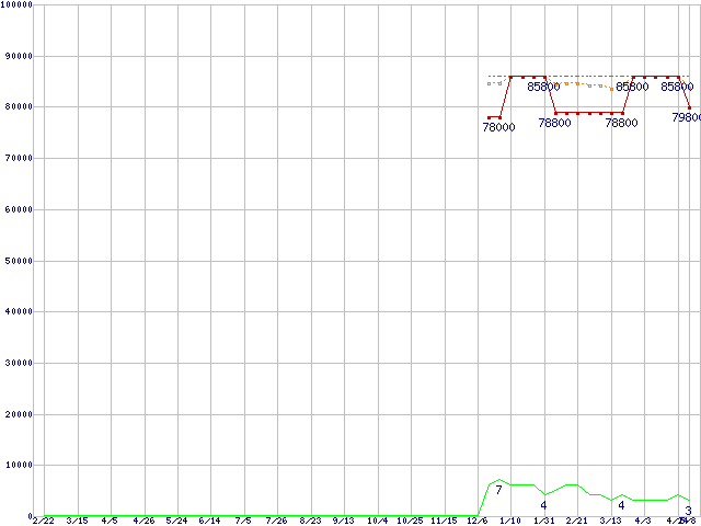 ※このグラフは過去のデータも税率5%相当に調整した税込み相当額のグラフです。 税率変更や、総額表示方式導入(2004年4月)の影響は除いています。 | | | ●凡例 | 最安値 (点線部は販売店未確認 または未調査) | 平均値 | 最高値 | ショップ数 |