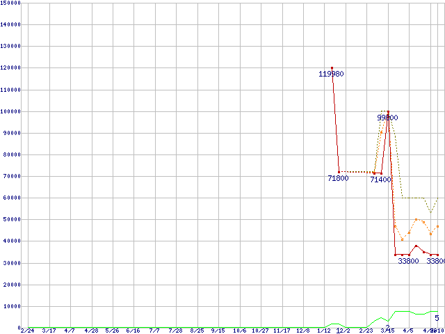 ※このグラフは過去のデータも税率5%相当に調整した税込み相当額のグラフです。 税率変更や、総額表示方式導入(2004年4月)の影響は除いています。 | | | ●凡例 | 最安値 (点線部は販売店未確認 または未調査) | 平均値 | 最高値 | ショップ数 |