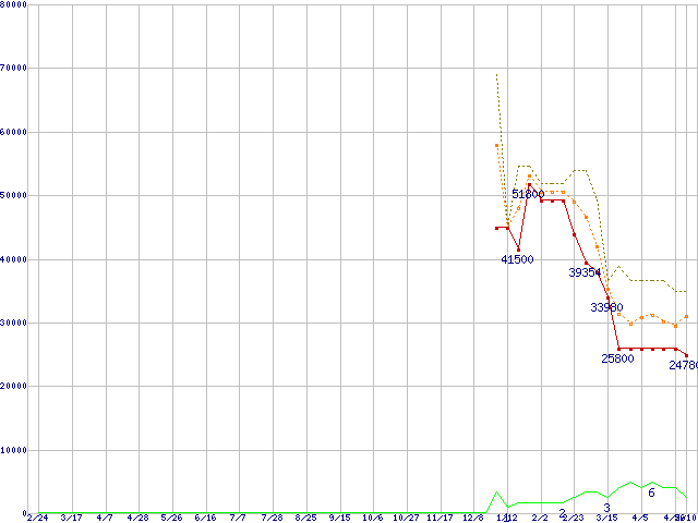 ※このグラフは過去のデータも税率5%相当に調整した税込み相当額のグラフです。 税率変更や、総額表示方式導入(2004年4月)の影響は除いています。 | | | ●凡例 | 最安値 (点線部は販売店未確認 または未調査) | 平均値 | 最高値 | ショップ数 |