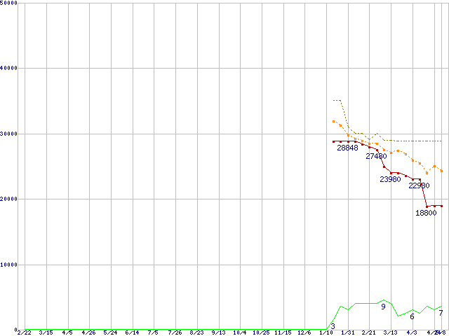※このグラフは過去のデータも税率5%相当に調整した税込み相当額のグラフです。 税率変更や、総額表示方式導入(2004年4月)の影響は除いています。 | | | ●凡例 | 最安値 (点線部は販売店未確認 または未調査) | 平均値 | 最高値 | ショップ数 |