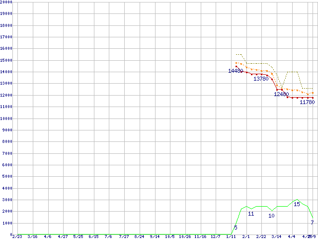 ※このグラフは過去のデータも税率5%相当に調整した税込み相当額のグラフです。 税率変更や、総額表示方式導入(2004年4月)の影響は除いています。 | | | ●凡例 | 最安値 (点線部は販売店未確認 または未調査) | 平均値 | 最高値 | ショップ数 |