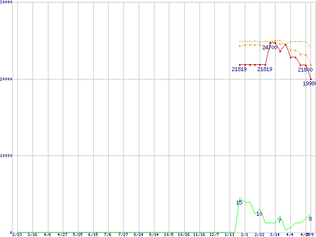 | Core 2 Duo E8200 (2.66GHz,L2 6MB)の価格推移 | | | (2007年2月23日~2008年5月9日) |