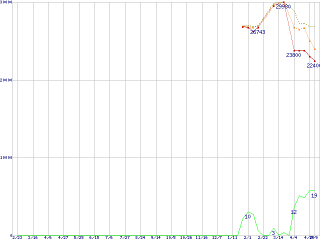 ※このグラフは過去のデータも税率5%相当に調整した税込み相当額のグラフです。 税率変更や、総額表示方式導入(2004年4月)の影響は除いています。 | | | ●凡例 | 最安値 (点線部は販売店未確認 または未調査) | 平均値 | 最高値 | ショップ数 |