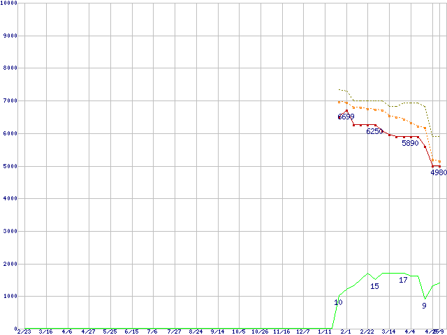 ※このグラフは過去のデータも税率5%相当に調整した税込み相当額のグラフです。 税率変更や、総額表示方式導入(2004年4月)の影響は除いています。 | | | ●凡例 | 最安値 (点線部は販売店未確認 または未調査) | 平均値 | 最高値 | ショップ数 |