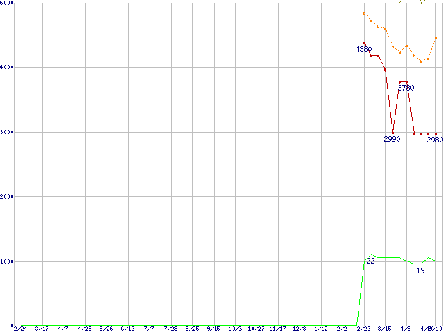 ※このグラフは過去のデータも税率5%相当に調整した税込み相当額のグラフです。 税率変更や、総額表示方式導入(2004年4月)の影響は除いています。 | | | ●凡例 | 最安値 (点線部は販売店未確認 または未調査) | 平均値 | 最高値 | ショップ数 |