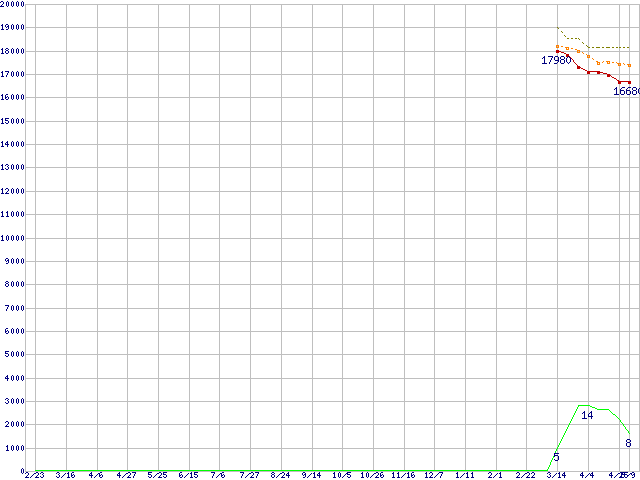 ※このグラフは過去のデータも税率5%相当に調整した税込み相当額のグラフです。 税率変更や、総額表示方式導入(2004年4月)の影響は除いています。 | | | ●凡例 | 最安値 (点線部は販売店未確認 または未調査) | 平均値 | 最高値 | ショップ数 |